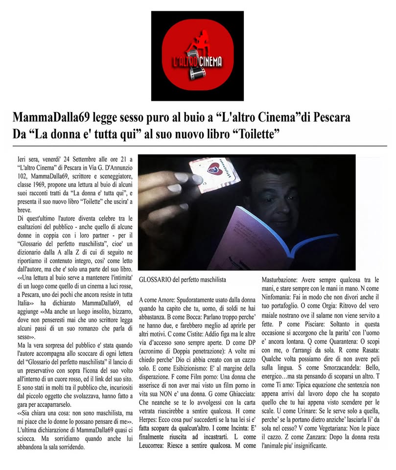 To all this the author will add a dose of his literary and screenwriting imagination as with his previous one dedicated to the porn actor Roberto Malone with Roberto Malone, or the Story of an Italian Porcupine, of Illustrious Madrigals and Fire Bedspreads, a good dose of his erotic-sexual fantasies, his personal experiences with women, his approach to the opposite sex and what, at the age of 56, it remains, considerations that in part have already emerged in his blook Skuz.